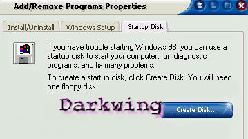 في البداية لابد أن يكون لديك قرص بدء التشغيل الخاص بويندوز 98 , فإذا كنت لا تمتلك هذا القرص ما عليك سوى عمل الآتي : أذهب إلى لوحة التحكم ( Panel Control ) ثم دبل اكليك على أيقونة ( اضافة وازالة البرامج ) ستجد ثلاث خيارات أختر ( قرص بدء التشغيل ) ( Startup Disk ) وضع قرصا في محرك الأقراص المرنة ثم اضغط على الخيار الظاهر أمامك على الزر ( إنشاء قرص ) ( Create Disk ) كما هو واضح أمامك في الصورة التالية :