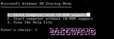 بعد ذلك سيعمل الجهاز على مسح كل ما يحتويه الدرايف ( C ) وبعد الإنتهاء من ذلك سيطلب منك الجهاز ضغط مفتاح الإدخال ( Enter ) اضغطه .. وهنا أهنيك فقد اجتزت المرحلة الأولى من فرمتة الجهاز وقد صار جهازك نظيفا , الآن عليك أن تثبت الويندوز كي تستطيع العمل عليه مرة أخرى .. الآن أعد تشغيل الكمبيوتر وقرص بدء التشغيل موجودا في محرك الأقراص المرنة , عندها سيعمل قرص بدء التشغيل فترة وسيعطيك الثلاث الخيارات السابقة الذكر ما عليك سوى اختيار الخيار الأول كما هو واضح أمامك في الصورة التالية :